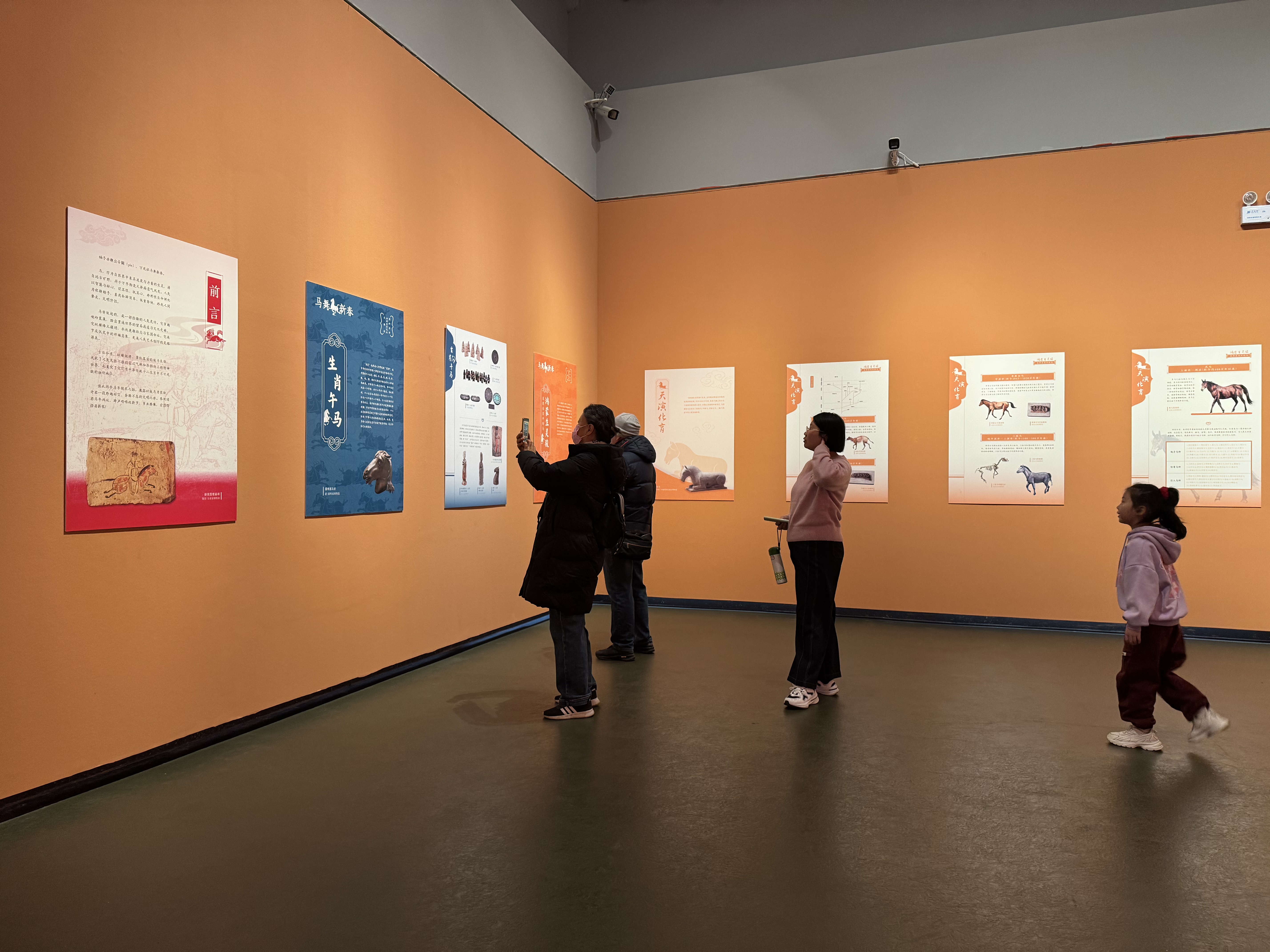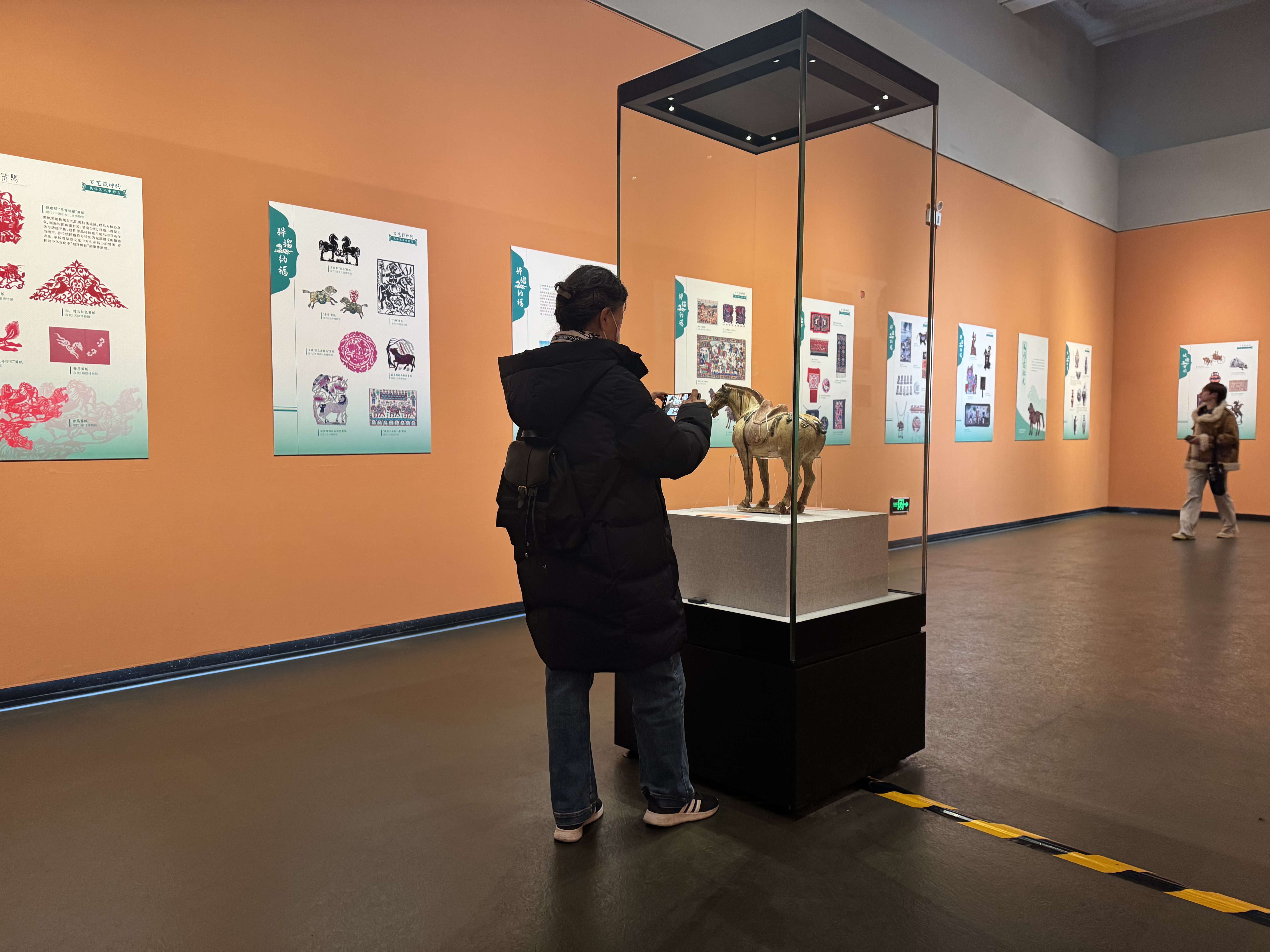 “为呼应新春佳节喜庆氛围,突出生肖主题,整体选用暖橘色为主色调,营造温暖祥和的观展环境。重点打造展览主题屏风,运用马赛克艺术手法,提取并重构文物中的马形象元素,形成既有现代视觉张力又富含传统生肖文化内涵的设计画面,强化展览的审美体验与文化传播力。”河北博物院艺术设计部文博副研究馆员赵雅聪介绍,特别是在10号展厅设计次屏风场景,以灯箱形式呈现“伯乐相马图”,搭配“马上封侯”等蕴含吉祥寓意的精品文物,既烘托马年鸿运的喜庆寓意,也传递奋发向上的精神内涵。
