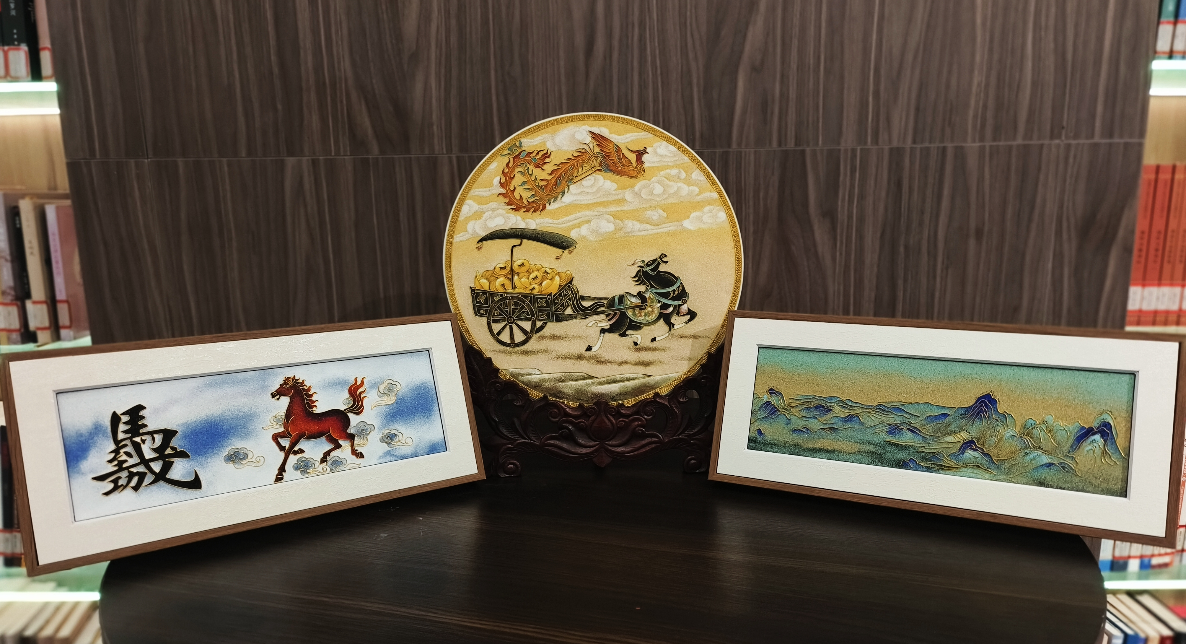 掐丝砂画是国家级非物质文化遗产掐丝珐琅(景泰蓝)工艺的衍生技艺,以色彩绚丽、工艺繁复著称,兼具观赏性与艺术性。它是在借鉴了传统的景泰蓝工艺中的掐丝、点蓝等工序的技术特点上创新的景泰蓝平面画,因彩砂而呈现特殊质感,画面以山水、人物、花鸟、动物呈现,富丽华贵、金碧辉煌,具有很高的观赏价值和收藏价值。