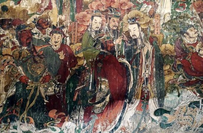 在我国壁画史上,毗卢寺壁画占有重要地位。毗卢殿内四壁,儒、释、道合流的水陆画,共绘有三教九流人物500多个。水陆画是佛家法事活动——水陆大会中的一种绘画形式。水陆大会是超度亡灵往生净土世界的一种宗教仪式。毗卢寺毗卢殿壁画中,既有神仙、菩萨、帝王将相、后妃女官、贤妇烈女,又有热情招徕顾客的货郎、为生计奔忙的民间说唱艺人以及泥瓦匠、石匠等等等。画中人物,虽千姿百态,却又浑然一体;虽三五成组,却也独立成幅,由此构成有主有从,变化多样的格局,每一幅都有故事,每一幅都有传说。