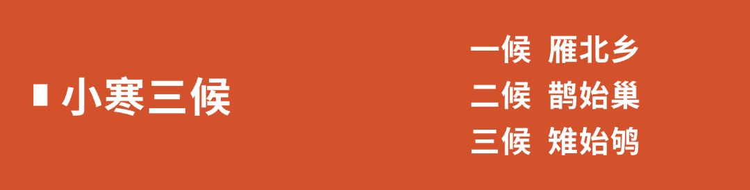 “禽鸟得气之先”,小寒虽处于“三九”隆冬时节,但此时阳气已经萌动,顺阴阳而迁移的候鸟大雁,感知到了阳气的初生而开始向北迁移。