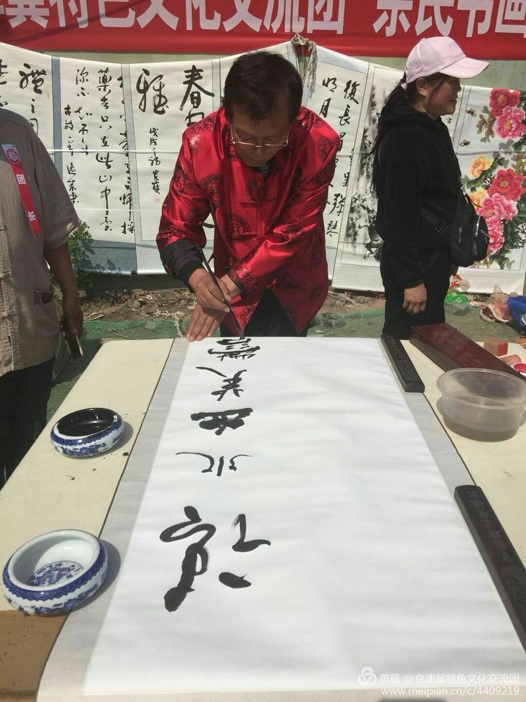 2018年农历三月三日,京津冀特色文化交流团中国传统书画组成亲民书画作品拍卖团,由团长栗书军带领10余名书画家走进河北省邯郸市邯山区张庄桥村传统庙会进行亲民书画拍卖交流。